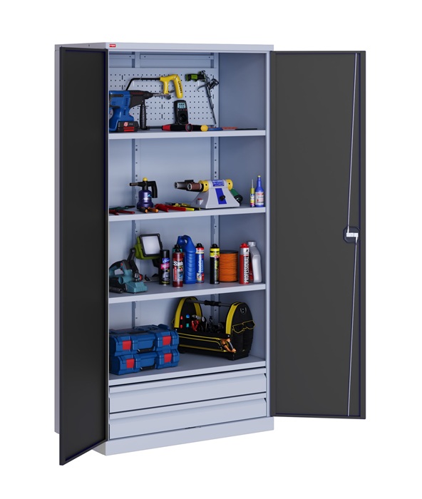 Инструментальный шкаф ИП-1/3 односекционный предназначен для хранения инструментов, слесарных приспособлений и других изделий на предприятиях, в мастерских, гаражах, подсобных помещениях. Представляет собой сборно-разборную металлическую конструкцию, собираемую при помощью саморезов. В комплектацию шкафа ИП-1/3 входит: корпус шкафа ИП-1, двери, 4 полки ИП-1, 2 выдвижных ящика ИП-1. Шаг перфорации для установки полок 83 мм. Нагрузка на полку - 60 кг, на ящик - 30 кг. Шкаф оборудован ключевым замок повышенной секретности и ригельной системой запирания. Дополнительно в шкаф возможно установить: полку ИП-1 (ВхШхГ) 917х438 мм, выдвижной ящик ИП-1 (ВхШхГ) 161х847х455 мм, перфорированный экран ИП-1 (ВхШхГ) 902х440х15 мм. Цвет шкаф - серый Ral 7035, двери - черный муар Ral 7021. Поставляется в разобранном виде