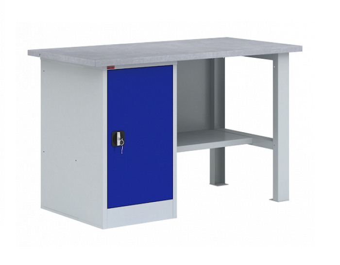 Металлические слесарный верстак ВП-2/1,6 представляет собой рабочий стол для ручной обработки металлических, деревянных изделий, а также предметов, выполненных из других материалов. Металлический верстак используется в мастерских, гаражах, автосервисах и в других рабочих зонах. Он являются основой, как небольшого промышленного производства, так и крупного предприятия. Допустимая равномерно распределенная нагрузка на верстак - 1000 кг, на полку верстачную - 40 кг, на полку тумбы- 30 кг. В комплект верстака ВП-2/1,6 входит: столешница СТ-1,6 из МДФ, покрытая оцинкованным листовым металлом, стенка задняя металлическая, металлическая верстачная опора, тумба Т-1 с двумя съемными полками. Дверь тумбы закрывается ключевым замком. Тумбу можно установить как с левой, так и правой стороны верстака. Дополнительно на верстак можно установить перфорированный экран соответствующего размера, аксессуары на экран. Цвет: верстак - серый Ral 7035, дверь тумбы - синий Ral 5002